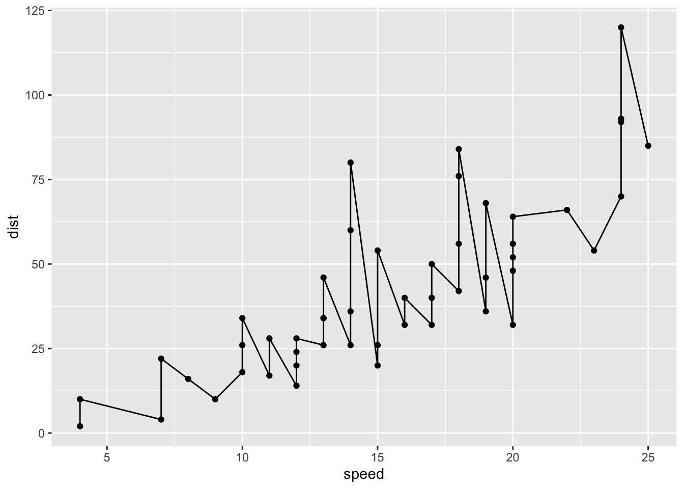 Let’s make the same plot with these two graphics systems. We can use the inbuilt cars dataset: