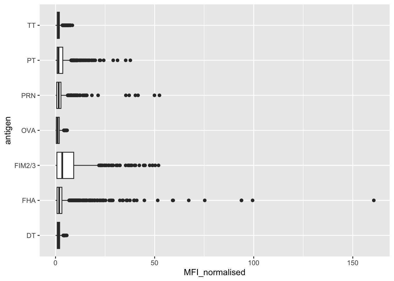 Q13. Complete the following code to make a summary boxplot of Ab titer levels (MFI) for all antigens: