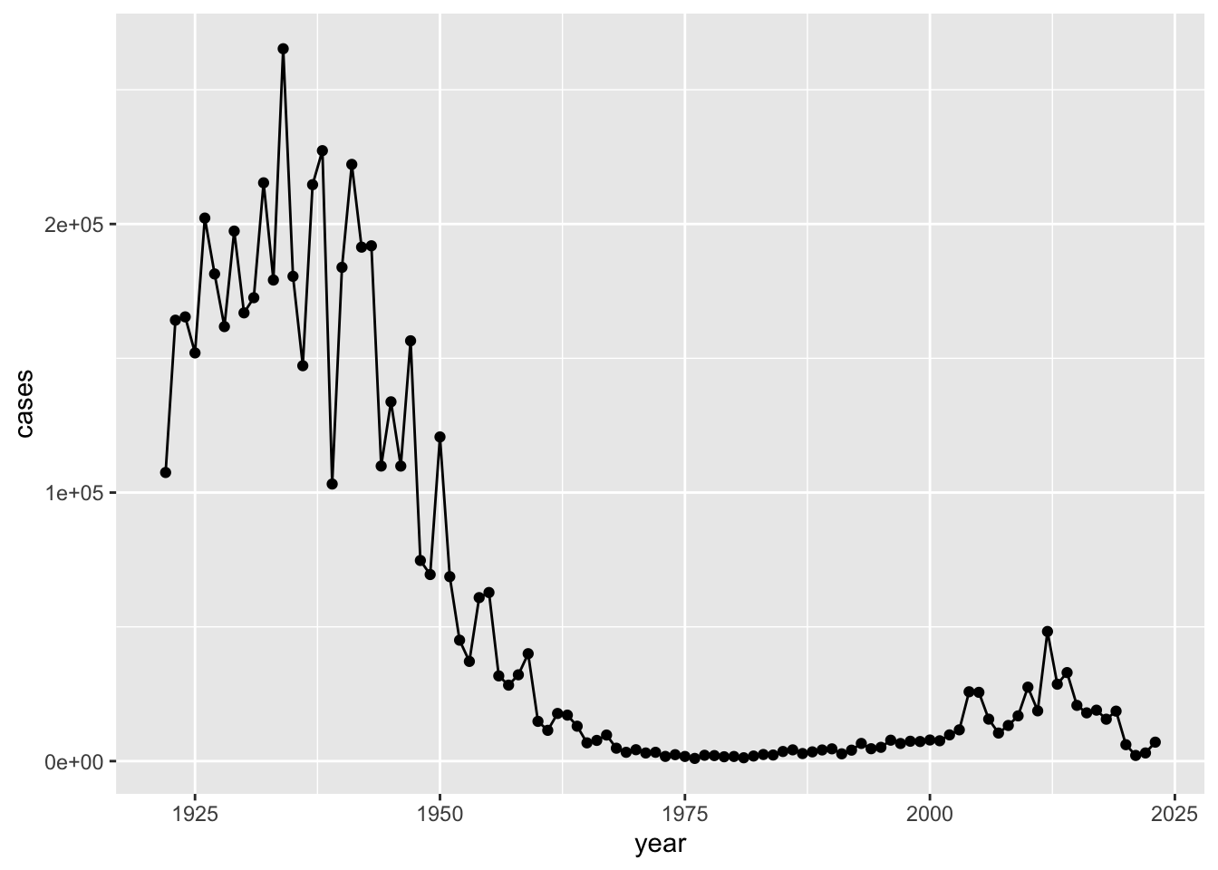 aes(year, cases) +