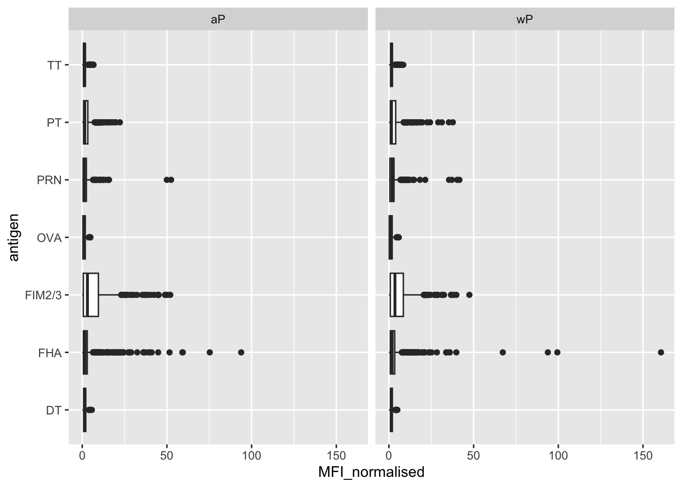 Q15. Filter to pull out only two specific antigens for analysis and create a boxplot for each. You can chose any you like. Below I picked a “control” antigen (“OVA”, that is not in our vaccines) and a clear antigen of interest (“PT”, Pertussis Toxin, one of the key virulence factors produced by the bacterium B. pertussis).