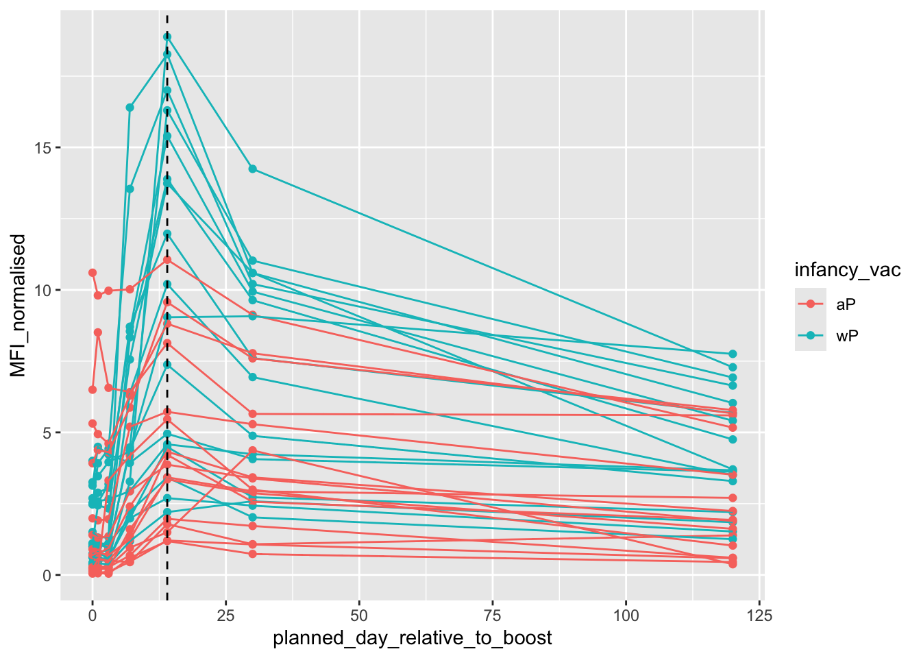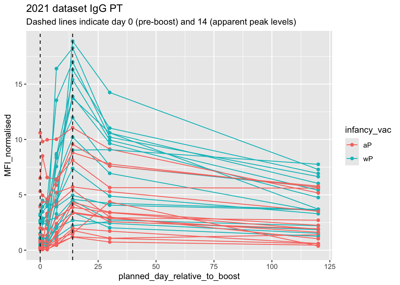 subtitle = "Dashed lines at day 0 (pre boost) and day 14 (post boost)",