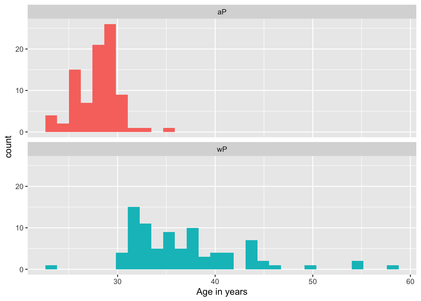 The wP group on average is older than the aP group. From this Welch Two Sample t-test the age difference betwen the two groups is definitey significant.
