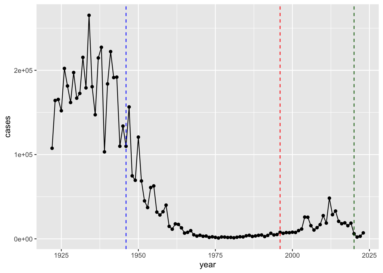 geom_vline(xintercept = 1946, col = "blue", lty = 2) +